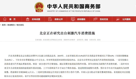 日前,商务部网站发布消息,针对突发疫情对消费市场的冲击,北京市正研究制定促进汽车消费政策措施,分别为“老旧车淘汰更新”、“10万新能源指标”、“增设京郊车牌”。虽然发布仅半天就迅速撤稿,但是对于受疫情冲击的车市而言,无疑是这个春天里重大的利好消息,业内人士也对政策最终出台保持乐观。