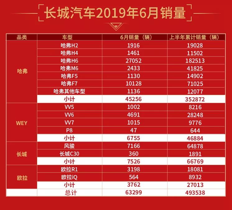 7月9日,长城汽车发布2019年6月产销数据。今年6月,长城汽车共销售新车63,299辆。至此,长城汽车2019年1-6月共销售新车493,538辆,同比劲增4.7%。其中,哈弗、WEY、欧拉和长城皮卡分别取得352,872辆、46,884辆、27,013辆以及64,878辆的出色成绩,有力地支撑了长城汽车的整体销量增长。
