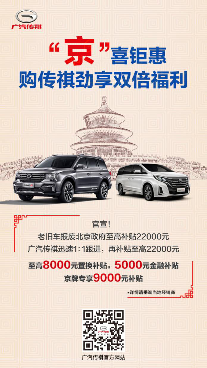 在北京市政府出台高排放老旧汽车淘汰“新政”后的24小时内,广汽传祺迅速响应,宣布1:1跟进,为北京消费者额外补贴最高22000元。符合标准的消费者,可享受广汽传祺提供的8000元置换补贴、5000元金融补贴、京牌专享9000元补贴等多重优惠。