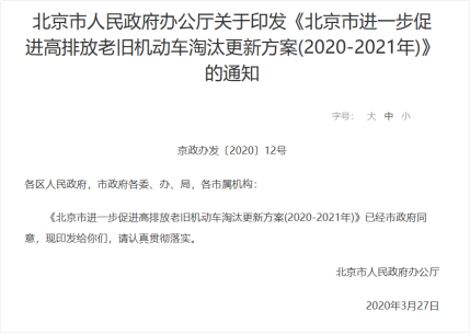 据了解,北京市人民政府办公厅关于印发《北京市进一步促进高排放老旧机动车淘汰更新方案(2020-2021年)》的通知,规定自2020年4月1日至2021年12月31日期间,提前报废或转出在本市登记注册的国Ⅲ排放标准汽油载客汽车和汽油载货汽车车主可享受政府补助。有强制报废期限的车辆需提前1年及以上进行解体报废,方可享受政府补助。