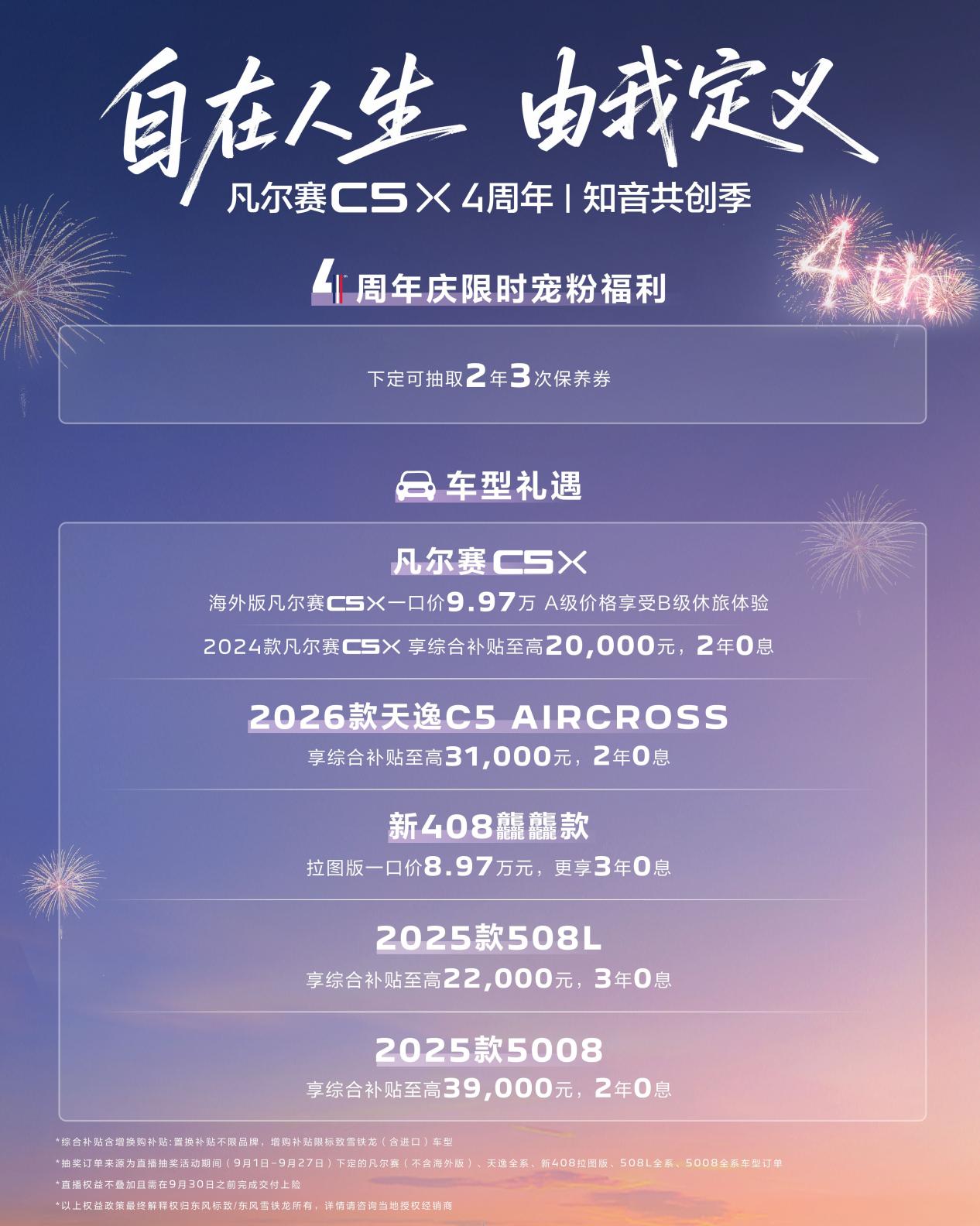 四载同行,感恩相伴;星光共聚,共创非凡。值此凡尔赛C5 X四周年之际,神龙汽车诚邀广大法系知音共赴盛会——无论是凡尔赛四周年知音共创派对武汉站的启幕、凡尔赛四周年知音共创派对湖南站的个性集结,还是凡尔赛四周年知音共创派对宁夏站的深度共创等。欢迎通过官方渠道报名参与,亲鉴东风雪铁龙与东风标致双品牌的产品实力与法式生活美学,共同书写更多属于知音的自在篇章!