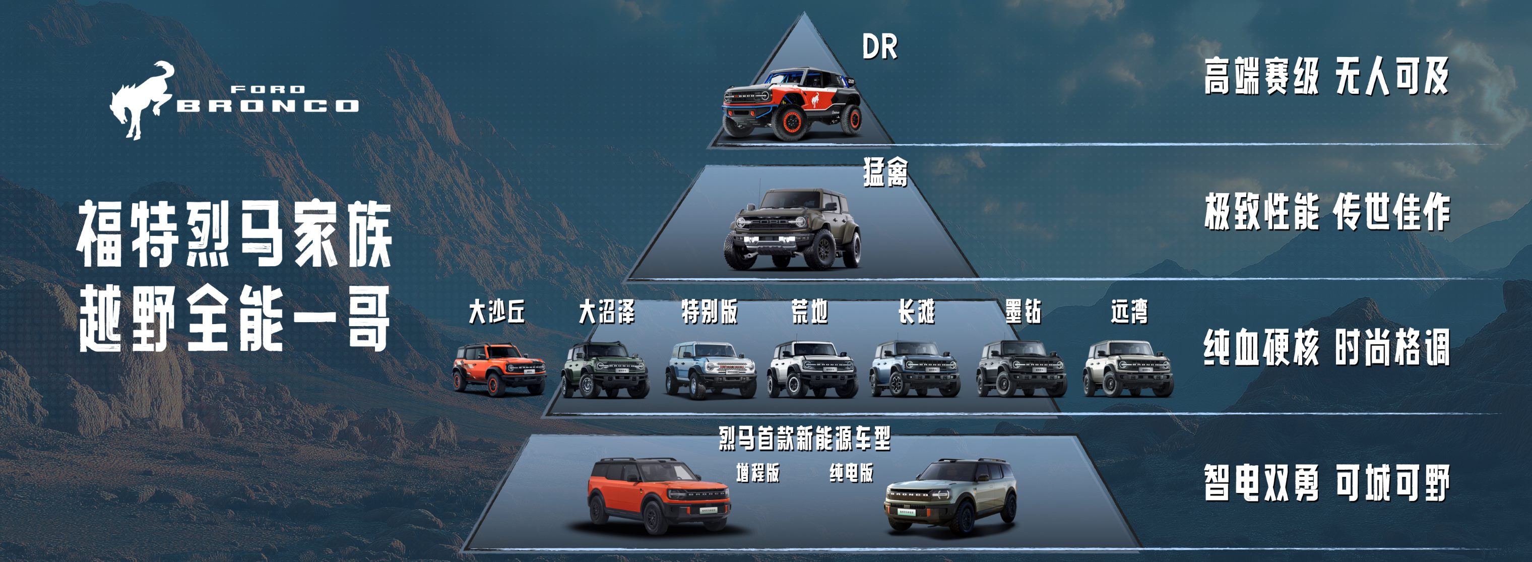 福特烈马已构建起顶级产品金字塔。从高端赛级越野无人可及的“烈马DR”,到福特高性能部门打造越野传世佳作“烈马猛禽”,再到一系列国产车型,包括全能越野标杆“大沙丘版/荒地版”、纯血硬核越野入门“长滩版/墨钻版”,全面覆盖硬核越野需求。