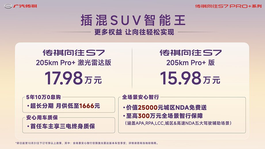 同时,作为向往系列第一车,传祺向往S7全新Pro+系列售价15.98万元起,更带来传祺史上最给力的金融政策:5年10万0息,月供低至1666元,还有价值25000元城区NDA免费送、至高300万元全场景智行保障,首任车主还可享三电终身质保,真正让“向往的生活”触手可及。