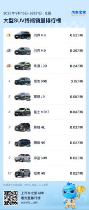 据汽车之家2025年9月第三周终端销量数据显示,昊铂HL位列大型SUV销量榜第七,领先腾势N9、深蓝S09等同级热门车型,展现出强劲的市场竞争力。