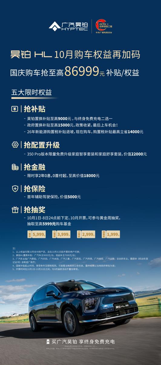为迎接国庆购车潮,广汽昊铂更推出四重限时购车礼遇,助力消费者轻松拥车: