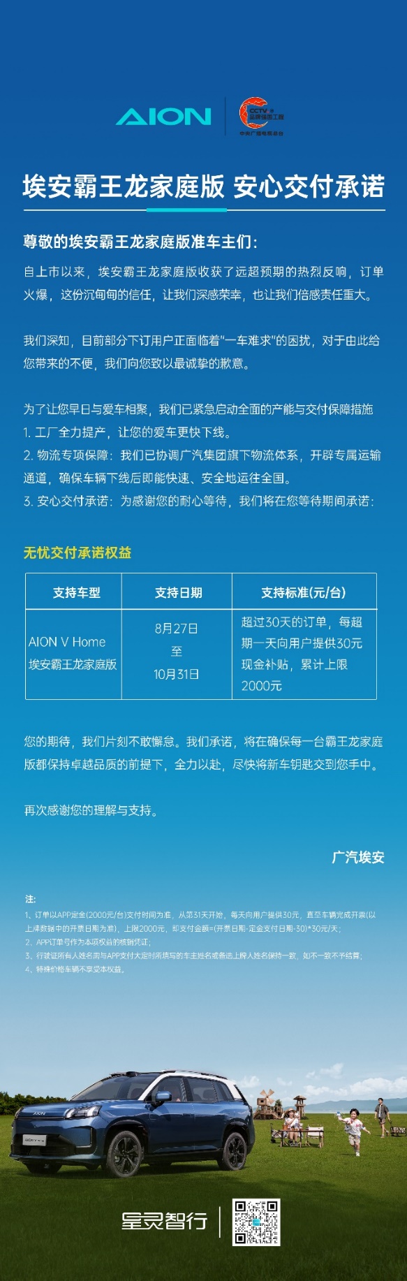 热销之下,广汽埃安也在全力提升产能,力保每位用户都能如期提车。同时,广汽埃安也于今天发布了霸王龙家庭版“安心交付”政策,针对8.27-10.31 APP下订、逾期30天未交付的客户,每超期一天向用户提供30元现金补贴,至高补贴2000元,并郑重承诺严格按照用户锁单时间先后进行配车和发运,确保经销商交付流程的公平、透明、有序。