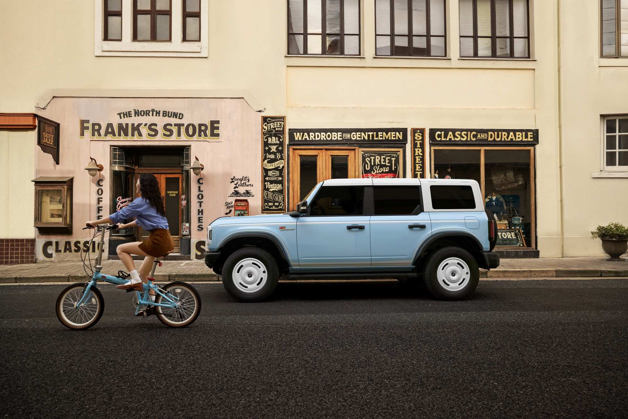 福特烈马1966大胆而纯粹的撞色设计,与江南园林水乡建筑风格中粉墙黛瓦的撞色巧思不谋而合。它们都是在对比中寻求和谐,在冲撞中达成平衡,依旧是设计领域最时尚的典范。正如江南园林以粉墙为纸、山石为绘,福特烈马1966亦以车身作画卷,用极致的色彩对比勾勒出超越时代的审美张力,它在硬核越野的底色中,生长出令人惊艳的时尚优雅。