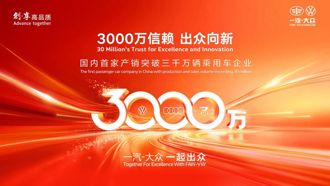 34载栉风沐雨,从一台车的品质坚守到3000万辆的信赖沉淀;从看不见的车身工艺到感受得到的服务温度,一汽-大众始终围绕“以客户为中心”的理念,在品质与服务的双轮驱动下,持续书写更多关于口碑与信赖的篇章。面对即将达成的3000万辆里程碑,一汽-大众将继续以严苛标准打磨商品,以创新服务温暖旅程,为更多家庭的美好出行保驾护航,在推动中国汽车产业高质量发展的道路上,续写更具分量的时代华章。