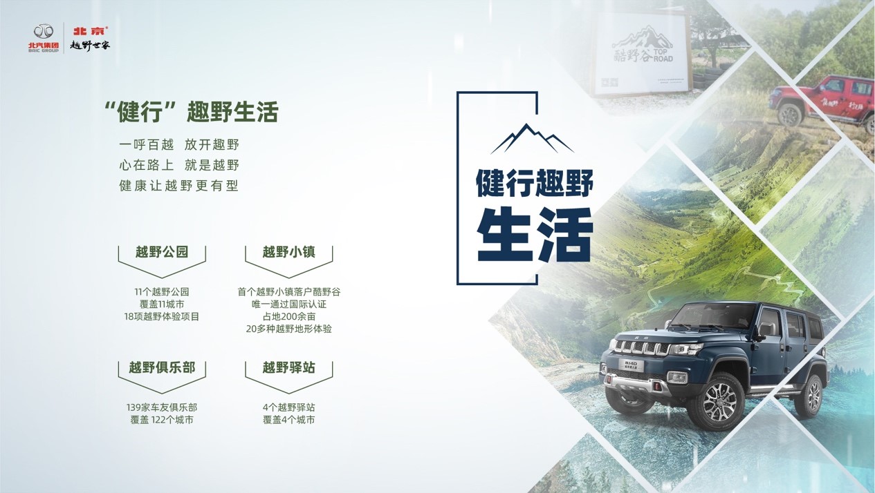 健行趣野生活。让更多人走出家门、拥抱自然,感受越野的魅力,是北京越野坚守的初心,而更具体验感的健行趣野生活圈,是北京越野表达越野心的最潮方式。北京越野精心打造了全国首座越野小镇,不久前落户北京酷野谷,它拥有国际认证的专业越野场地。同时,北京越野还将在全国范围内建设越野公园、越野驿站、越野俱乐部,构成北京越野独有的体验生态。