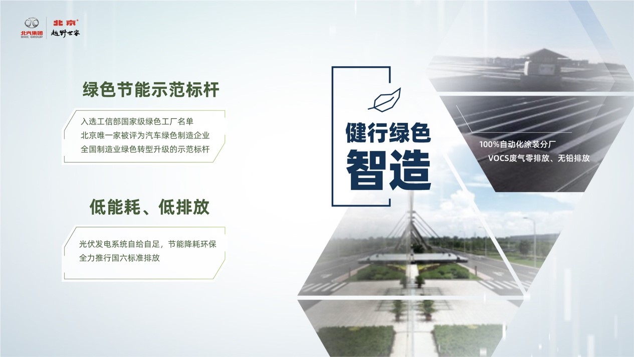 健行绿色智造。北汽越野车是北京市唯一一家汽车绿色制造企业,是全国唯一专注越野车生产的现代化制造基地,入选了工信部国家级绿色工厂名单。北京越野通过运用光伏发电系统,坚持低能耗、低排放发展,在节能降耗绿色环保、保障资源健康可持续的基础上,实现了动力能源的自给自足。