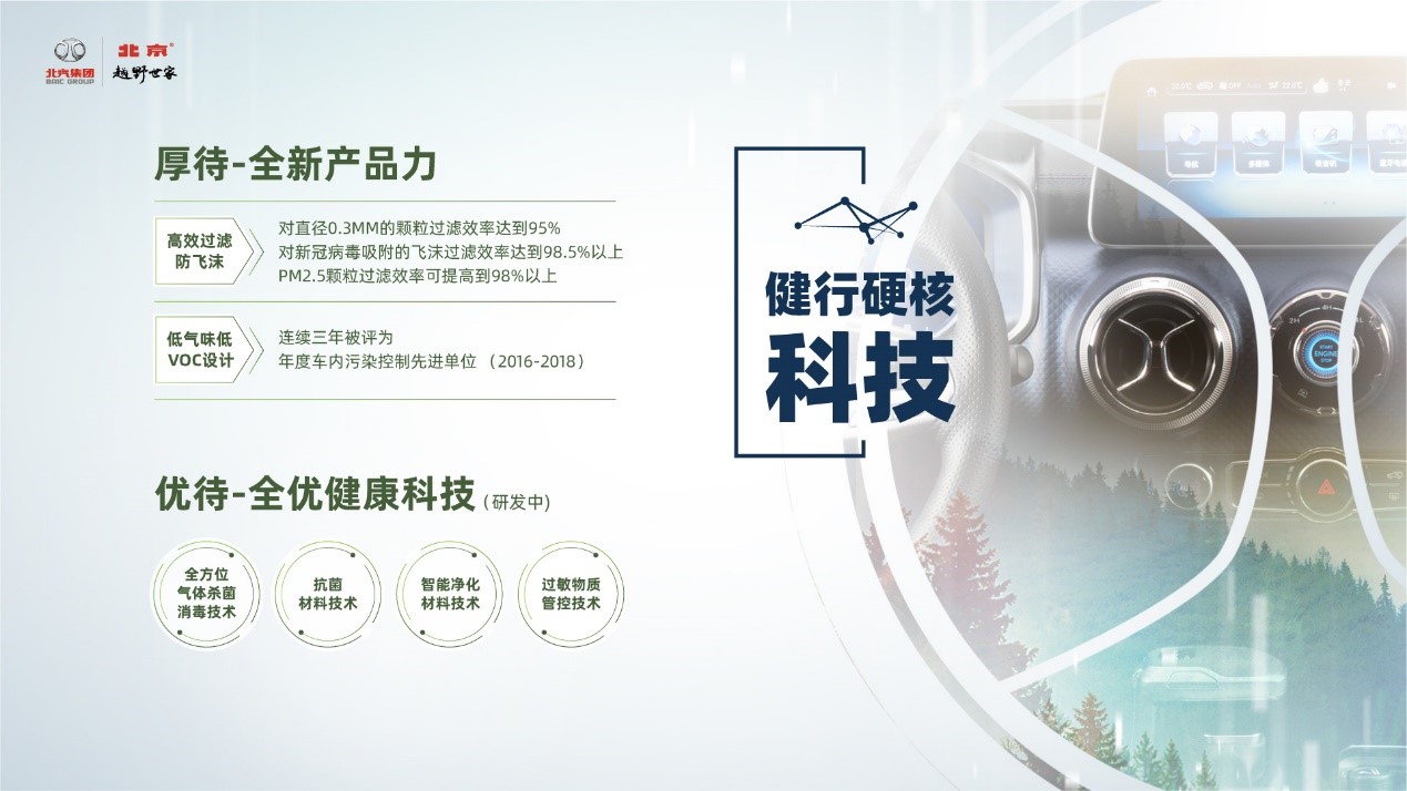 健行硬核科技。依托于国内唯一的千人规模越野车研究院,北京越野在最短时间内突破了CN95级高效过滤、低气味低VOC材料两大核心技术。“健行方舟”所搭载的CN95级高效过滤技术,可有效阻隔PM2.5以及新冠病毒飞沫,效率分别达98%和98.5%,相当于为汽车戴上了口罩;同时,北京越野也成为了第一家经认证的CN95过滤净化技术的越野车企业。正是在这样硬核科技的加持下,北京越野“健行方舟计划”才得以顺利落地,成为越野车领域的典范。同时,北京越野还在“全方位气体杀菌消毒”、“抗菌材料”、“智能净化材料”、“过敏物质管控”等深度健康应用上持续投入研发力量,一个更加绿色、健康的旅途来日可期。