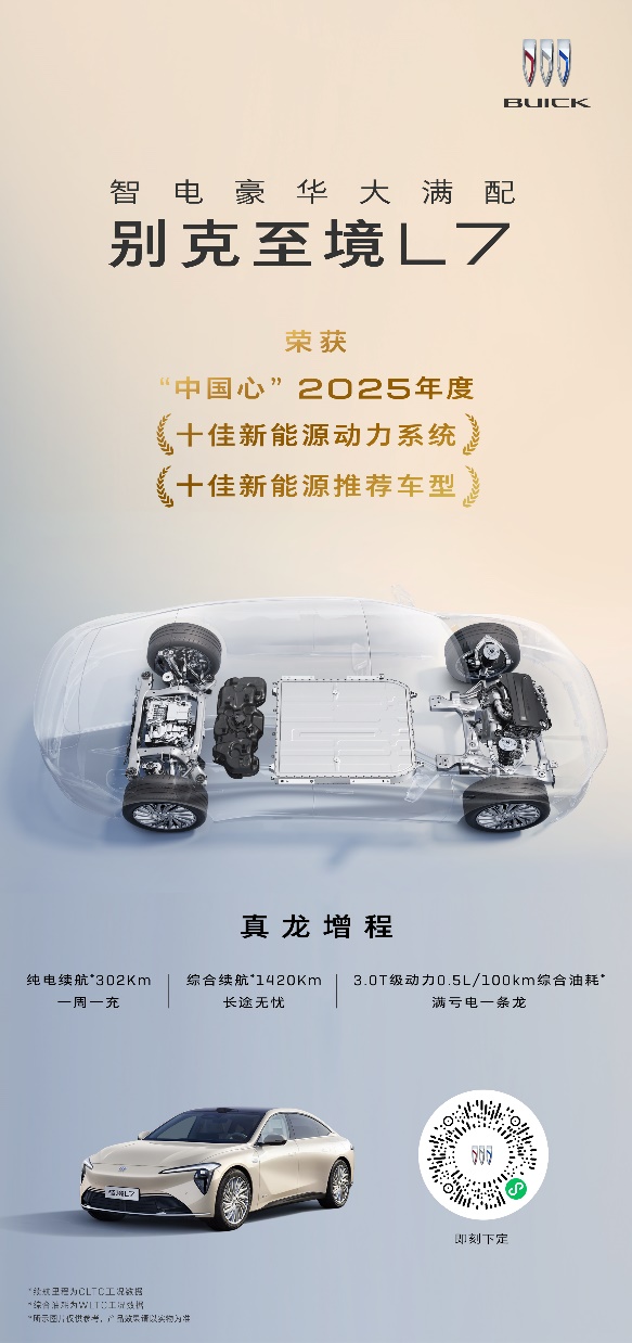 【中国汽车趋势网 11月8日讯】日前,备受业界关注的“中国心”2025年度十佳新能源汽车动力系统评选榜单发布,别克至境L7搭载的“真龙”增程系统实力上榜,荣膺年度“十佳新能源动力系统”,至境L7同时获得“十佳新能源推荐车型”。继10月份刚刚斩获“2025年中国十佳车身”之后,此次又赢得“中国心”十佳两项殊荣,反映出行业权威专家对别克至境L7的技术突破与越级实力的高度认可。