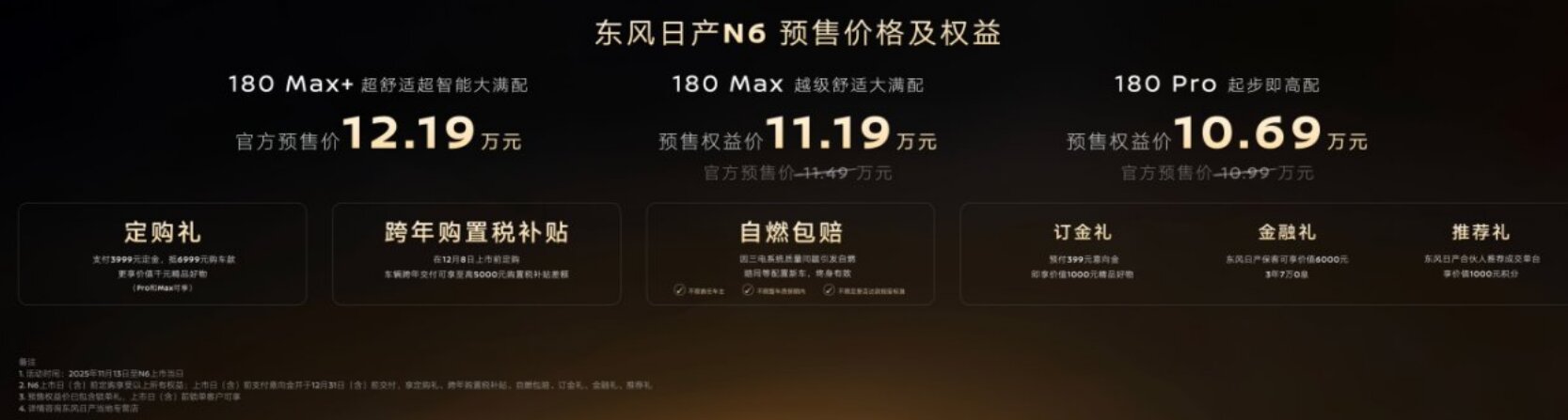 为回馈消费者,预售期间推出多重诚意权益:支付3999元定金可抵6999元购车款;至高享5000元限时跨年购置税补贴;叠加订金礼、金融礼、推荐礼等,至高权益价值达11000元。目前N6产能充足,11月内完成大定即可在12月8日(正式上市日)同步提车。值得关注的是,东风日产还推出行业首个新能源“自燃包赔”政策:不限首任车主、不限质保期、不限是否报废,因三电质量问题自燃即补偿同等配置新车,N系列新老车主终身同享,彻底解决用户安全顾虑。