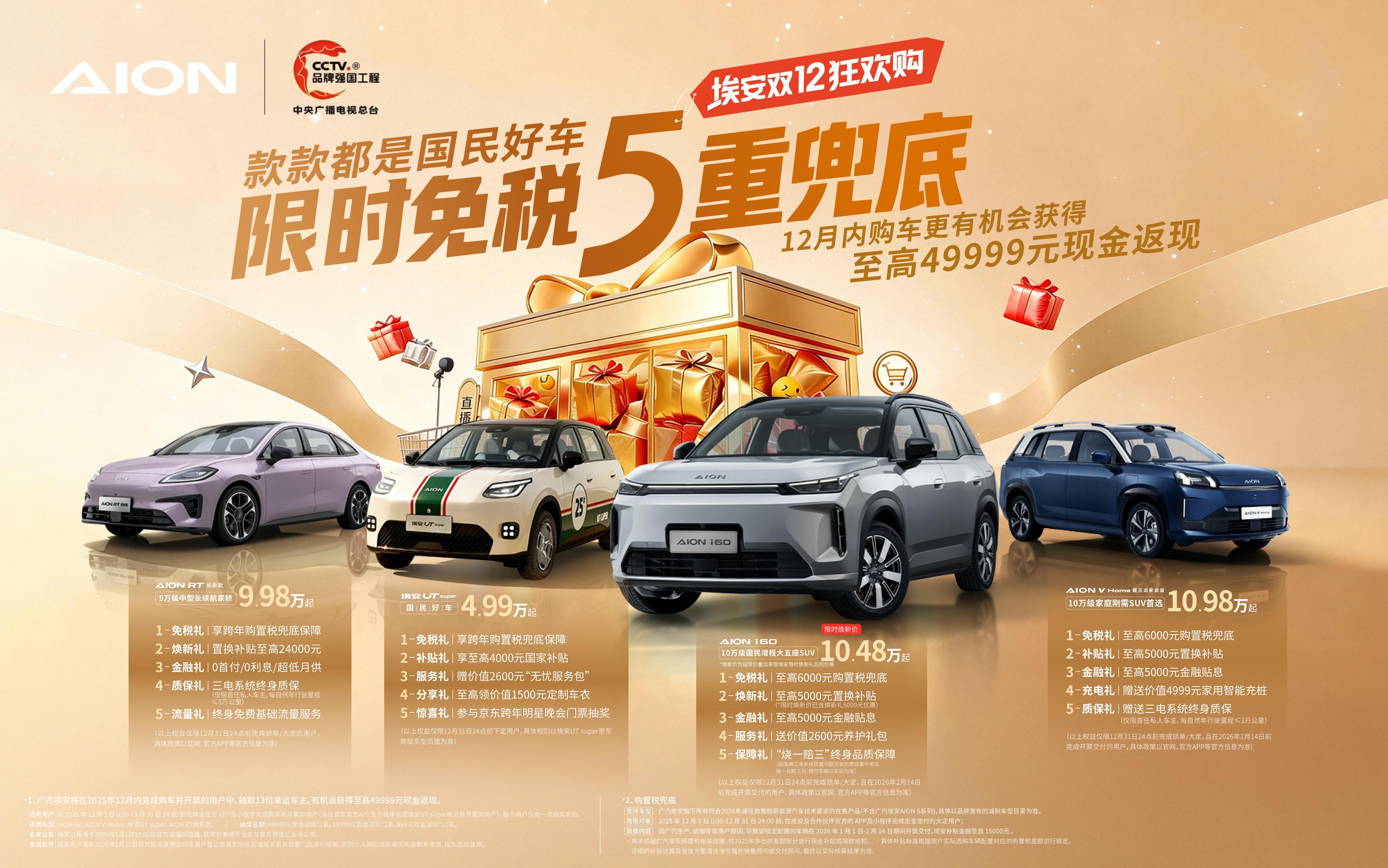 新能源领军企业广汽埃安,率先启动“埃安双12狂欢购”,以高品质国民好车,叠加行业首个“限时免税5重兜底”,为消费者送上“定心丸”。不仅承诺购置税兜底、提供丰厚礼包,更有购车抢至高49999元现金返现超级福利,堪称年末不容错过的“抄底”良机,让家庭用户省钱省心把爱车开回家。
