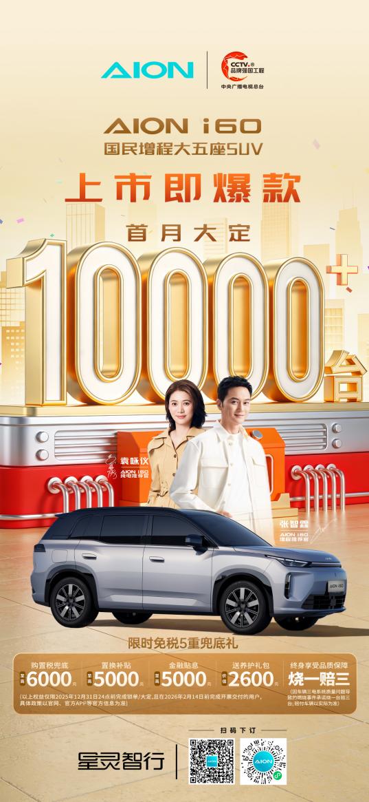 【中国汽车趋势网 12月19日讯】在新能源汽车市场竞争白热化的当下,“上市即爆款”已成为众多品牌的营销标配,但真正经得起市场检验、实现首月大定破万的车型却不多。埃安i60自11月16日上市首月累计大定突破10000台,以扎实销量印证了其“10万级增程SUV普及者”的含金量。这不仅是一款产品的成功,更是广汽集团面向新能源时代战略转型的关键落子,也是用户真实需求与技术普惠理念的精准对齐。