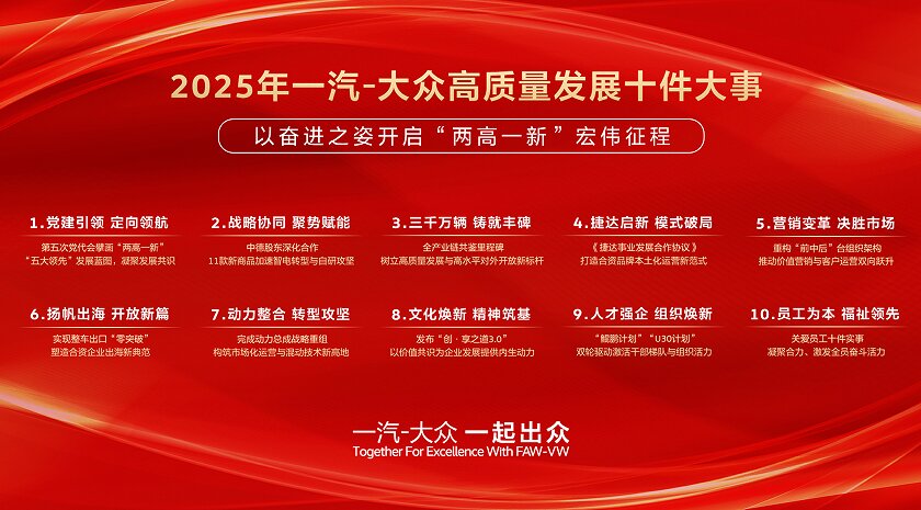 【中国汽车趋势网 12月22日讯】回望2025年,一汽-大众秉持产业报国初心,勇担央企合资企业使命,实现了稳健经营与高质量发展。站在“十四五”与“十五五”交汇的历史节点,一汽-大众以“十件大事”为笔,擘画了面向未来的崭新蓝图,为企业长远发展筑牢了坚定基石。