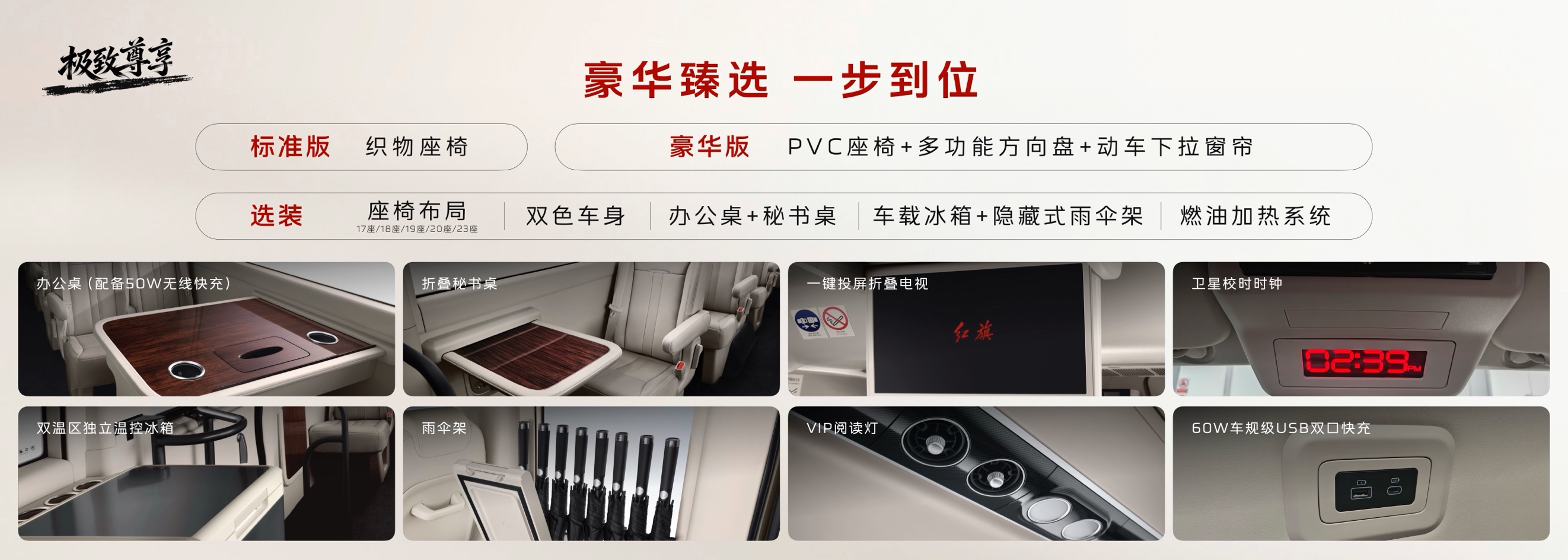 此外,营运专属一键投屏折叠电视、60W车规级USB双口快充、卫星信号毫秒级自动校时时钟等配置,充分满足娱乐与办公需求。针对不同出行场景,红旗金葵花国悦营运版还提供了丰富的个性化选装,提供包括集成50W无线快充的办公桌、车载冰箱、雨伞架等丰富原厂选装配置。
