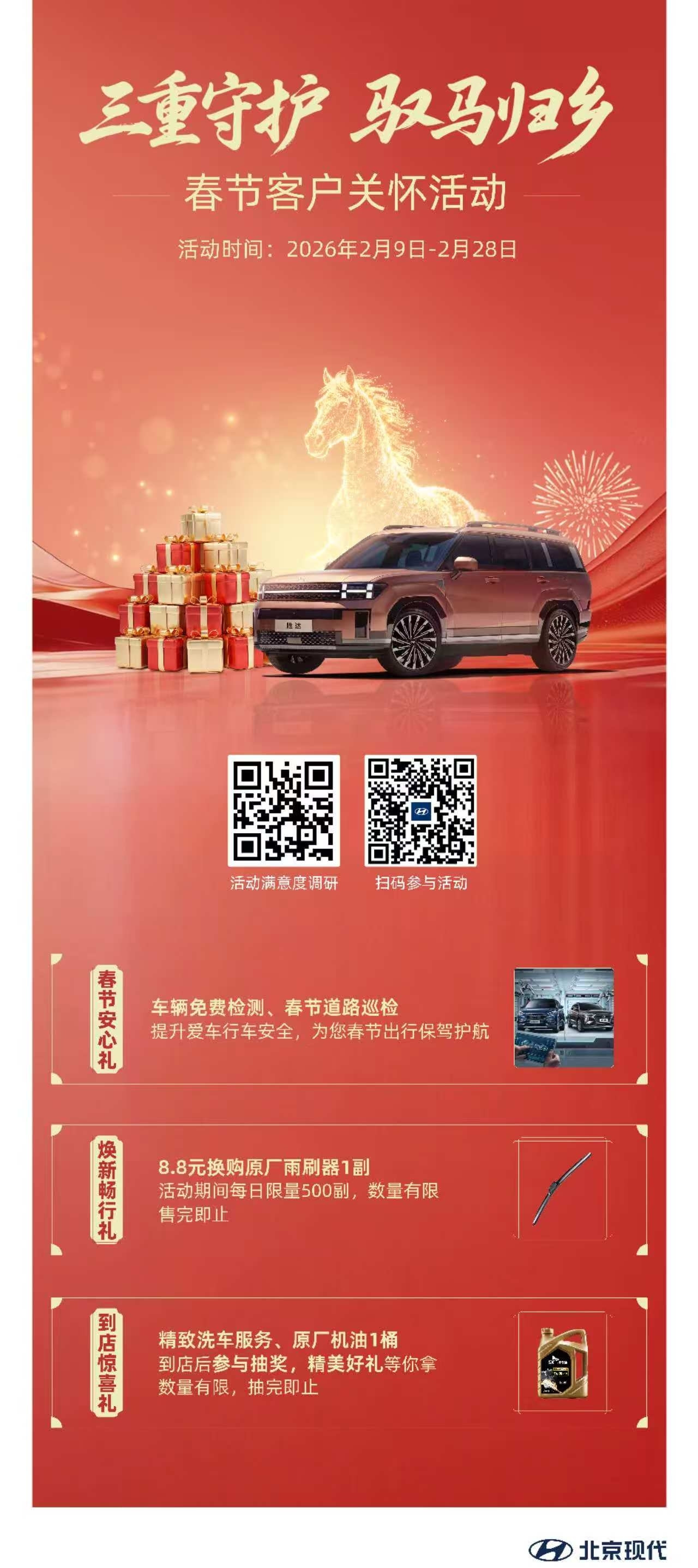 三重服务分别为爱车服务:车辆检测、轮胎充气、玻璃水添加等服务;温暖服务:提供热饮、暖宝宝贴、方便面等温暖服务;应急救援:道路救援、搭电服务及简易故障排查等服务。另外,北京现代还推出客户关怀三重礼活动,其中“春节安心礼”包括车辆免费检测、春节道路巡检,为春节出行保驾护航;“焕新畅行礼”:8.8元换购原厂雨刷器1副(活动期间每日限量500副);“到店惊喜礼”:精致洗车服务、原厂机油1桶,同时还有精美好礼抽奖活动。守护伴全程,平安过新年,北京现代用关怀铺就了用户的温暖归途。