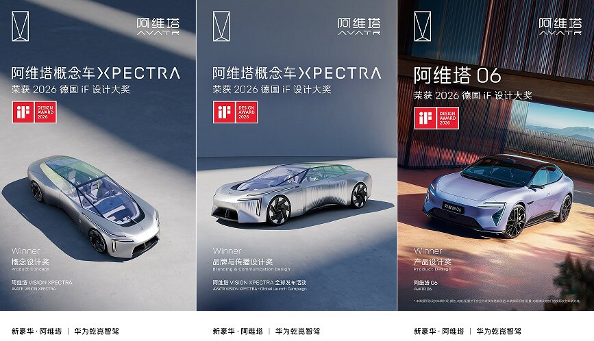 【中国汽车趋势网讯】2026年2月26日(上海),阿维塔科技宣布,阿维塔概念车XPECTRA、阿维塔06荣获三项2026德国iF设计大奖。作为以设计驱动的新豪华品牌,阿维塔一举斩获三大奖项,不仅证明了世界设计界对阿维塔原创设计的高度肯定,彰显了阿维塔“情感新奢”理念的独特魅力,更是中国新豪华汽车品牌在全球设计领域持续突破的有力印证。