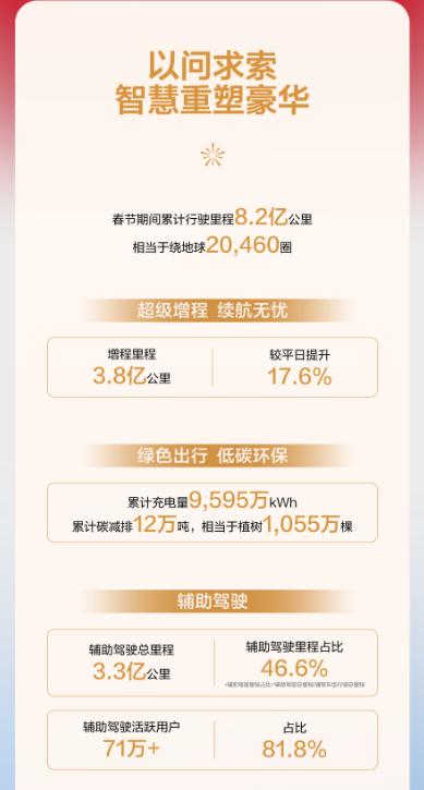 这个春节,问界用数亿公里的陪伴,温暖每一段奔赴团圆的归途;用7万余次主动守护,诠释了“安全是最大的豪华”;用春节不打烊的服务,让用户出行更省心、舒心和开心。智慧护航归途,爱意照亮前路,展望2026,问界汽车将携手每一位用户,持续探索智慧出行新体验,与万千家庭共赴美好新程。