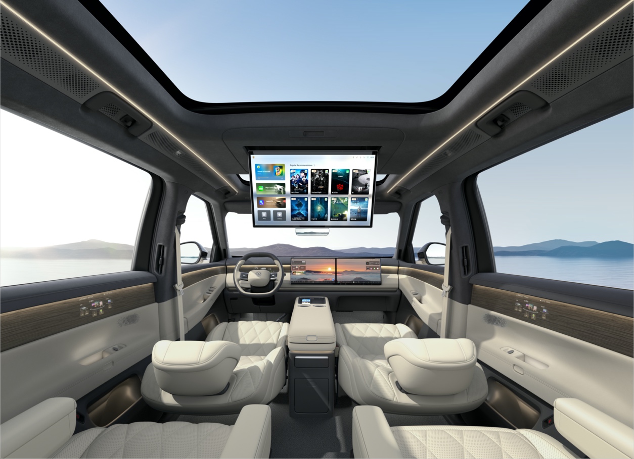 进入车内,ID. ERA 9X内饰延续外观“大气、纯粹、硬朗”的设计精髓,以“方圆合蕴”为核心设计理念,将德系功能美学与东方空间哲学融于座舱之中。一体环抱式座舱架构是空间语言中最直观的体现。一道连续且流畅的线条自驾驶席前方自然展开,沿水平方向延伸,并柔和包裹至两侧车门,形成完整而统一的空间轮廓。这种环抱式设计在视觉上强化整体感,在心理层面则为全车成员营造出稳定、安心的空间氛围,成为座舱归属感的起点。