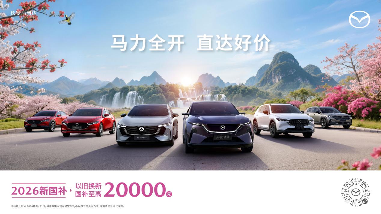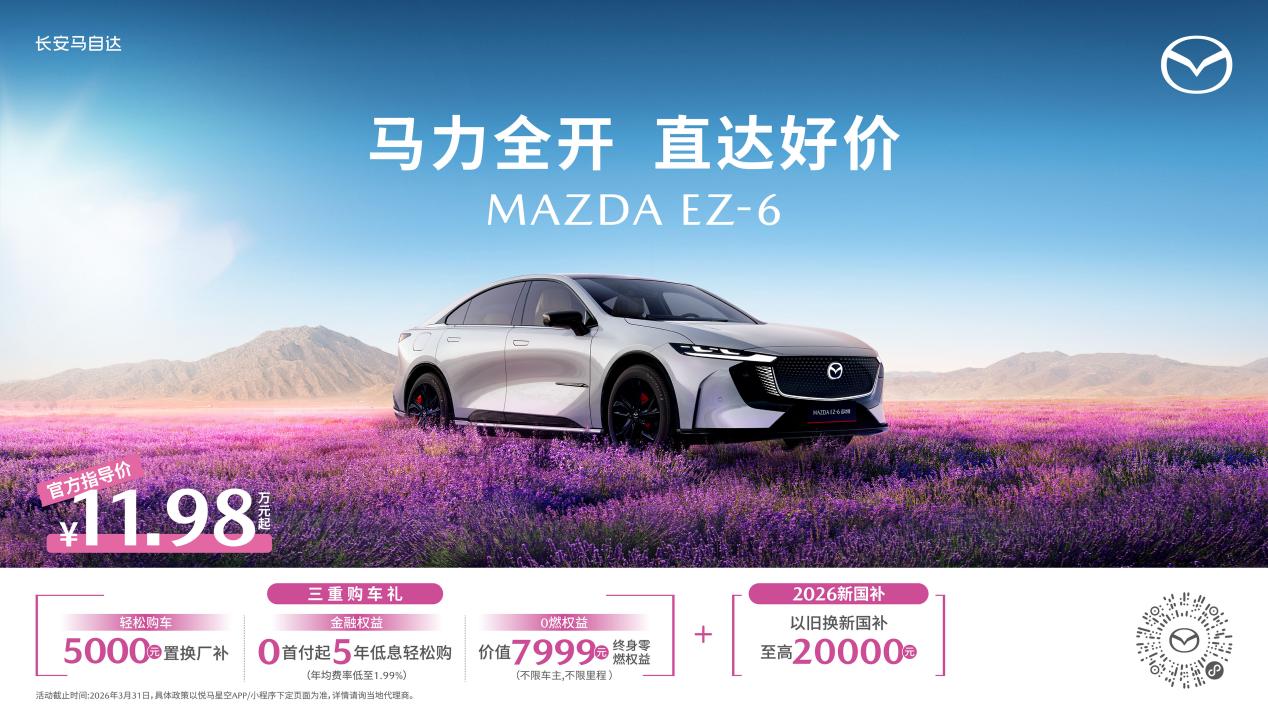 【中国汽车趋势网 3月3日讯】马年就开马自达,马上好运自达!三月春暖花开,正是全家郊游的好时节,长安马自达全系车型推出新春钜惠,即日起至2026年3月31日,MAZDA EZ-60购车可享5年超长低息购车方案、5,000元国补叠加补贴、3,000元选配基金等多重专属好礼;MAZDA EZ-6购车0首付起,另享至高20,000元新国补;MAZDA CX-50行也焕新一口价13.98万元起,MAZDA3昂克赛拉全系8.99万起,MAZDA CX-5全系限时11.58万起,MAZDA CX-30全系9.99万起。每一款车型都是全球顶级安全与品质之选,让“人马一体”驾趣体验触手可及。