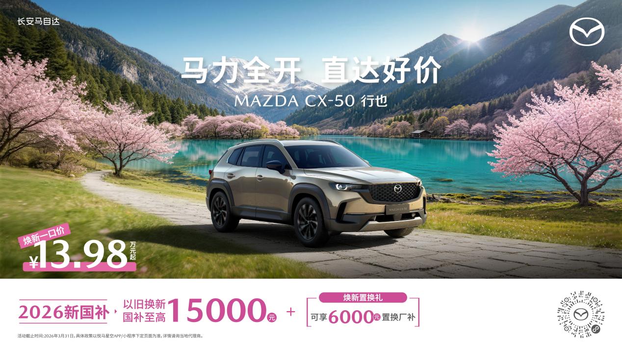 活动期间,CX-50行也焕新一口价13.98万元起,叠加6,000元置换厂补与至高15,000元以旧换新国补,质价比再攀新高。以“山系生活宽体SUV”为精准定位,CX-50行也凭借宽体车身带来的越级空间、全路况通过性,以及与户外生活场景的高度适配性,完美契合当代家庭“城市通勤+户外旅行”的多元出行需求,成为新春阖家出行的理想伴侣。安全保障上,CX-50实力堪称同级标杆——全球范围内上市以来,连续多年荣膺北美IIHS TSP+顶级安全之选,同时在C-IASI中保研测试中斩获6项全优成绩。高强钢车身搭配全域主动安全系统,从硬件到软件全方位筑牢安全防线,让每一次家庭出行都安心无忧。