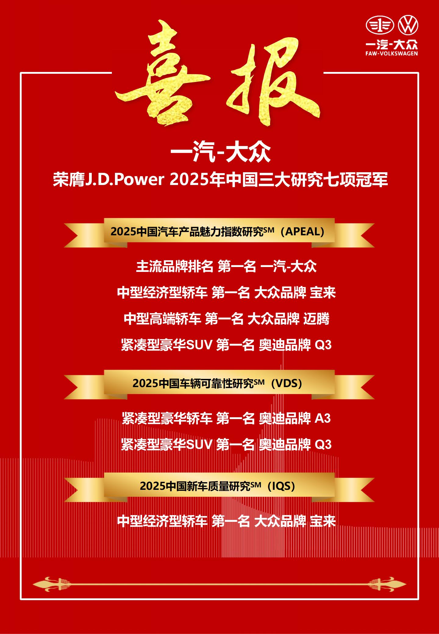 【中国汽车趋势网讯】3月19日,全球领先的消费者洞察与市场研究机构J.D. Power|君迪在武汉举行2026年度论坛暨颁奖典礼,公司荣膺2025年中国三大研究七项冠军。其中,在2025中国汽车产品魅力指数研究SM(APEAL)中,公司获得主流品牌第一名,大众宝来、大众迈腾、奥迪Q3分列各细分市场魅力指数第一名;在2025中国车辆可靠性研究SM(VDS)中,奥迪A3、奥迪Q3分列紧凑型豪华轿车、SUV第一名;在2025中国新车质量研究SM(IQS)中,大众宝来获得中型经济型轿车第一名。J.D. Power作为全球领先的消费者洞察和市场研究机构,其基于真实车主反馈的奖项在行业内具有极高权威性,此次一举斩获多项研究冠军,不仅是公司卓越商品品质与可靠性的有力印证,也深刻体现了广大消费者对品牌与商品的高度认可与信赖。