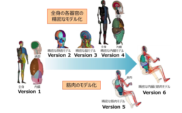 以研发车辆安全技术为目的,丰田与丰田中央研究所于2000年共同开发了世界首款能够还原、解析车辆碰撞时对人体的全身伤害的虚拟人体模型“THUMS”。之后经过不断进化,至去年公布的最新版Version6,THUMS不仅拥有骨骼、大脑、内脏,还增加了肌肉,同时也增加了不同性别、年龄、体格的模型。相较于碰撞安全试验中被广泛使用的假人模型,THUMS更加精密地还原了人体的形状及强度,能够更详细地解析碰撞导致的伤害。不仅如此,因THUMS可在电脑上进行模拟实验,通过重复模仿及解析各种碰撞场景,可大幅减少碰撞试验所需的时间及经费。