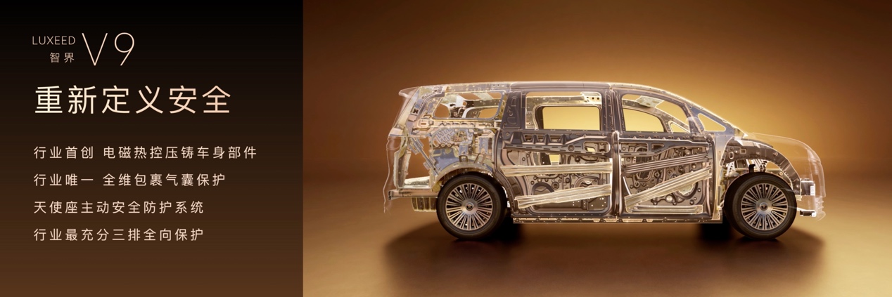 此外,行业唯一全维包裹安全气囊,全方位守护头颈胸等关键部位,带来“金钟罩”般的防护。智界V9采用行业首创电磁热控压铸车身部件,车身强度大幅提升,搭载天使座主动安全防护系统等配置,打造行业最充分三排全向保护,以安全是最大豪华的硬核实力,重塑MPV安全标杆。