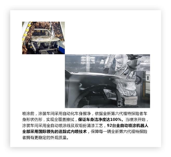 电泳完成后,全新第六代福特探险者再经历机器人自动涂胶密封,就将展开车身喷涂。全新第六代福特探险者外观特征之一的“悬浮车顶”与普通的黑车顶工艺差别很大,除了车顶是黑色之外,还需将A、B、D柱和上边梁涂黑,以此给人更加运动、豪华的感觉。