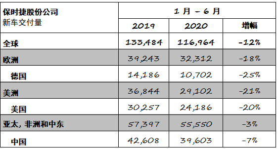 2020 年上半年,亚太、非洲和中东市场呈现出积极的增长态势,保时捷在这些地区的新车交付量共计55,550台。其中,韩国和日本表现突出,新车交付量分别达4,242台和 3,675台,同比均实现了双位数的增长。在欧洲,保时捷向客户交付32,312台新车。美国市场的新车交付量为24,186台。