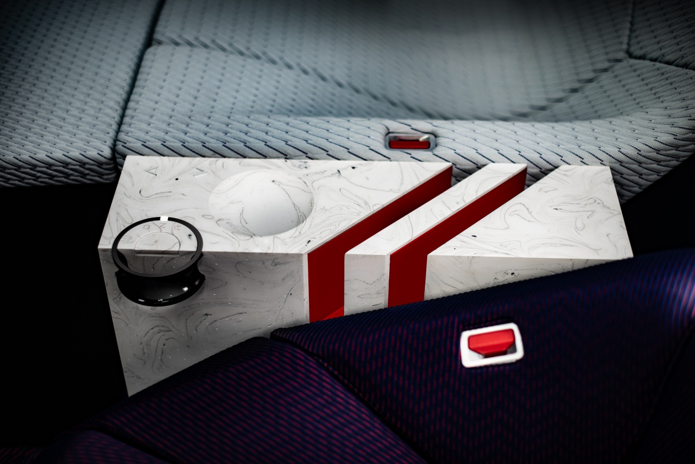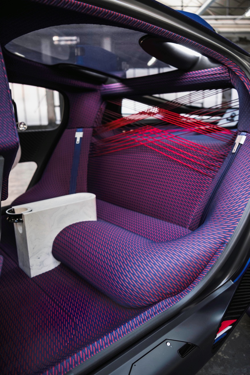 后排座椅更像一个“蚕茧”。它可延伸到行李箱的沙发,就像Riva船(意大利一种豪华小汽艇)的遮阳甲板。乘客可以将头放在V形红色弹性织物制成的吊床式棚布上,也可轻松地将私人物品存放在后备箱里。