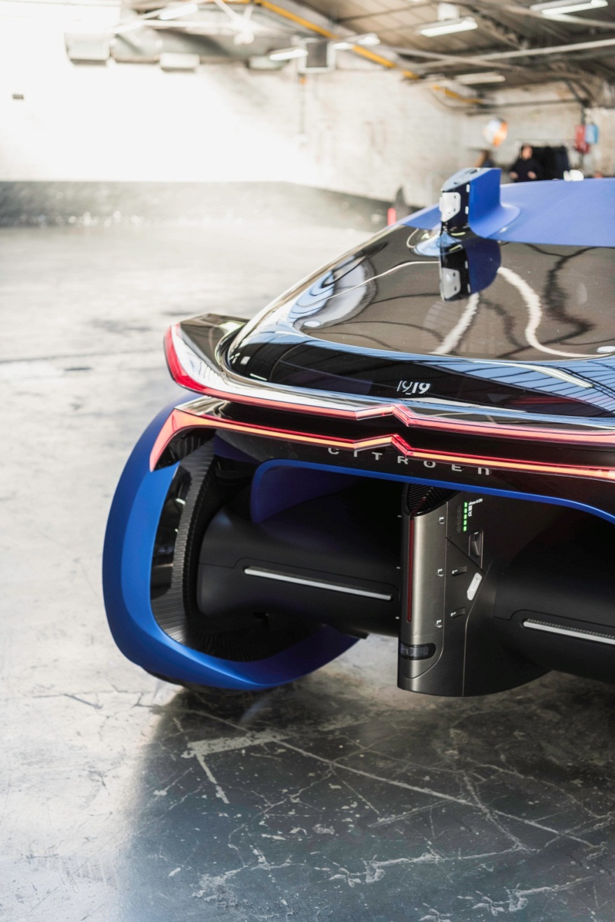 车尾采用了与车身前端相同的特色设计,包括后挡板透明圆形罩、空气动力学支架和灯光排列等,首尾呼应。后窗是凹面的,也旨在致敬品牌传奇车型AMI6、CX以及最近的C5、C6等。两条LED灯线形成“Y”的双人字线条,凸显车辆独具一格的风格同时也担当了空气动力扰流板的功效。