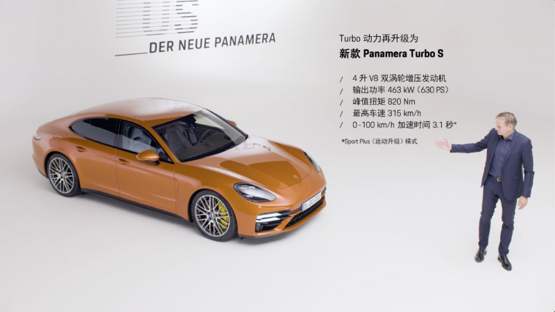 新款Panamera Turbo S的最大输出功率为463 kW(630 PS),最大扭矩为820 Nm,相较此前配备内燃机的旗舰款Turbo车型分别增加了59 kW(80 PS)和50 Nm,性能表现显著提升。当选择“Sport Plus”(运动升级)驾驶模式时,其从静止加速至100 km/h仅需3.1秒。由魏斯阿赫开发并于祖文豪森制造的著名4.0升V8双涡轮增压发动机经过全面强化,将最高车速提升至315 km/h。新款Panamera Turbo S已经在传奇的纽伯格林北环赛道上证明了其卓越的性能:测试车手拉尔斯?克恩(Lars Kern)在这条全球最严酷的20.832 km赛道上跑完一圈,仅用时7分29秒81,创造了新的“行政轿车”最快圈速官方纪录。