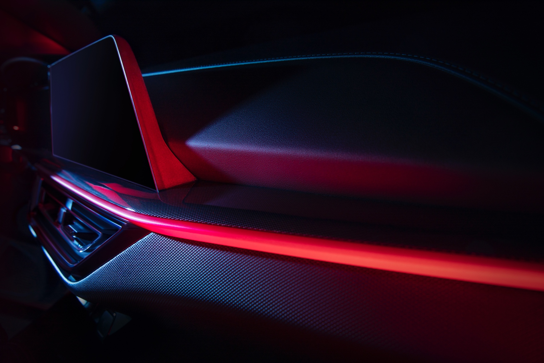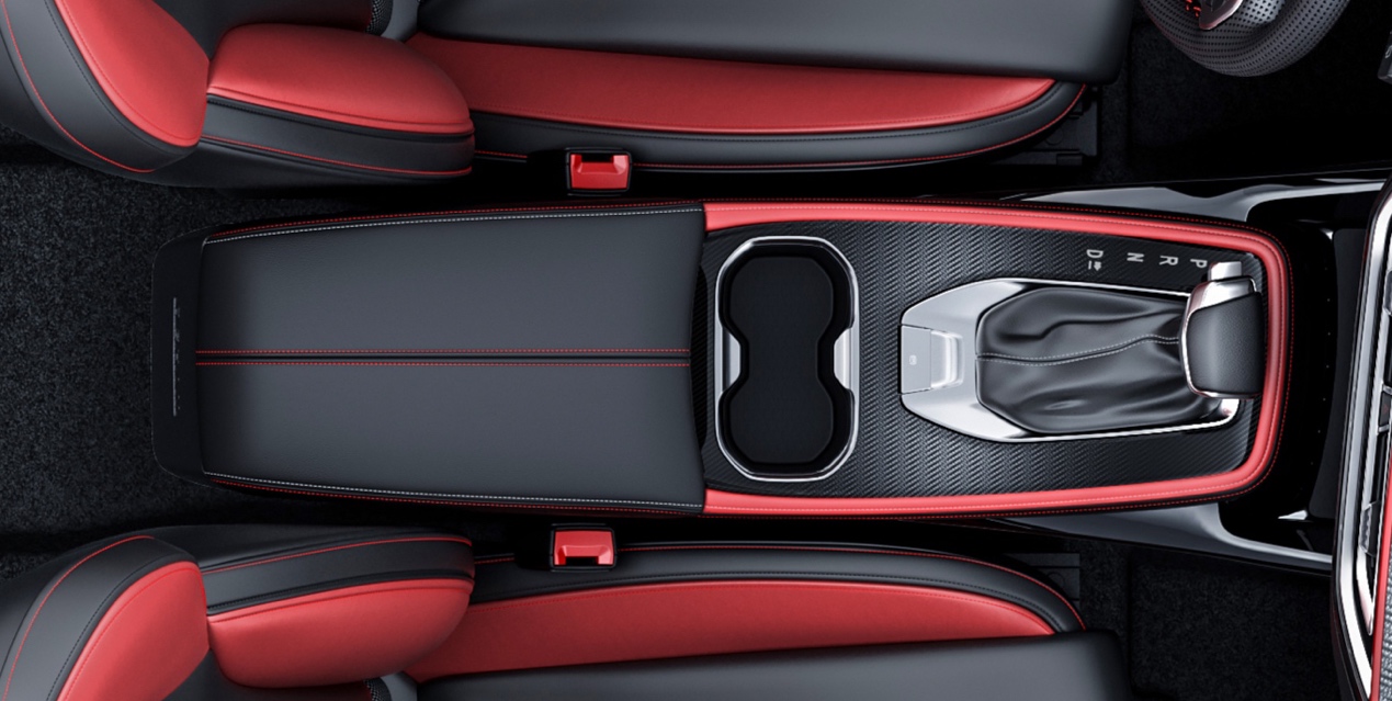 回形空调出风口,声微风柔,采用了三层镀铬设计,红色内饰点缀,与中控竞速光带相呼应,左右对称分布,这也是为了中和不规则设计带来的失衡,实现视觉上的平衡。