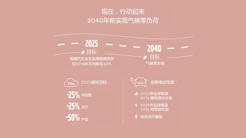 作为实现这一愿景的第一步,沃尔沃汽车计划于2018至2025年期间,将旗下每辆汽车全生命周期中的碳排放平均降低40%。这包括将每辆汽车的尾气排放减少50%,业务运营(包括制造和物流)碳排放量降低25%,与全球供应链相关的二氧化碳排放量减少25%。