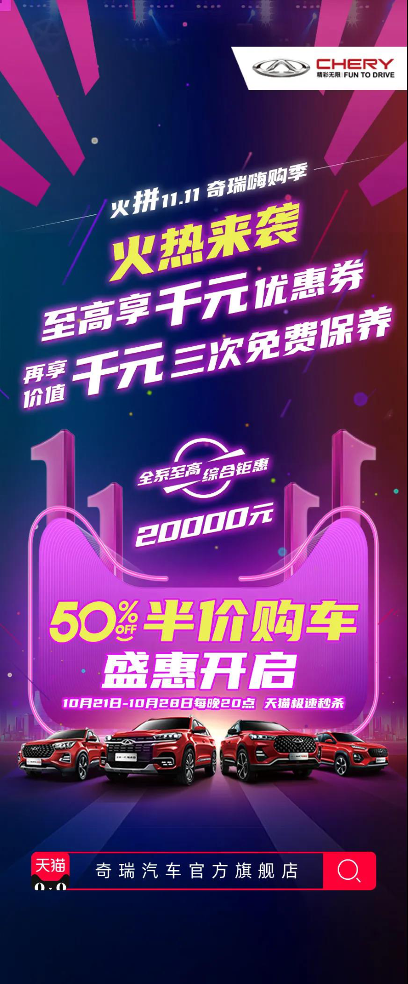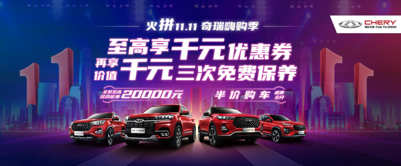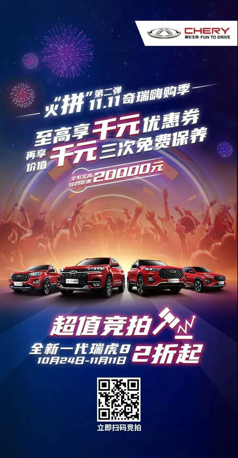 10月21日-11月11日,凡购买全新一代瑞虎8、全新一代瑞虎7神行版、全新一代瑞虎5x、艾瑞泽GX PRO等在内的指定车型,综合钜惠20000元,再享至高1000元优惠券和价值1000元三次免费保养!