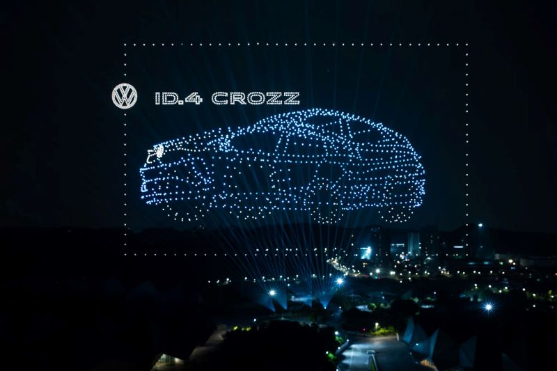 整场无人机表演的拍摄时间超过4天,每天分为2次各10分钟的飞行,使用8架常规4K摄像无人机以及2架6K FPV摄像无人机进行拍摄。无人机组成的最宽编队为直径达450米的“地球”图案,而组成的最大ID.4车型图案采用83:1的比例,长400米,宽161米,高142米。