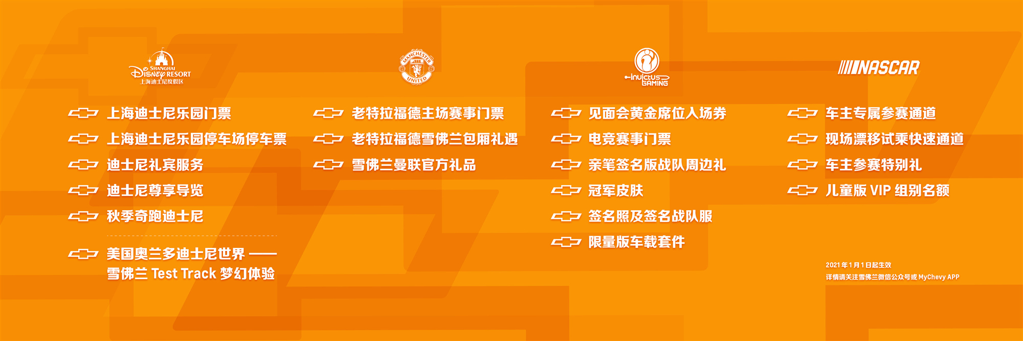 在15年的发展历程中,雪佛兰始终以“客户至上”为宗旨,深入洞察客户需求,致力于为客户带来更优质的用车体验。本次金领结之夜公布的50项车主特权,包括4大类别7大系列,涵盖迪士尼、曼联、iG战队等多个品牌知名合作伙伴的平台资源以及U·CLUB会员特权和各类官方活动体验权益。雪佛兰车主可以兑换上海迪士尼门票,尊享迪士尼贵宾服务,还能收获独家放送的秋季奇跑迪士尼名额;此外,2020-2021赛季曼联英超主场比赛的门票、iG战队电竞赛事门票都为你准备就绪;而由雪佛兰官方主办的陆上飞行秀、直通NASCAR挑战赛等系列活动也为车主量身定制了亲临现场的席位。只要成为雪佛兰车主,你就可以加入U·CLUB车主俱乐部,享受各类用车、养车礼遇;不仅如此,各大知名视频网站、在线音乐的会员权益及四大车展门票,都将让你的生活变得丰富多彩。从2021年1月1日起,雪佛兰50项车主特权将正式生效。届时,广大雪佛兰车主将切实感受到专属于他们的荣誉感和归属感,尽享与雪佛兰相伴的更多乐趣。
