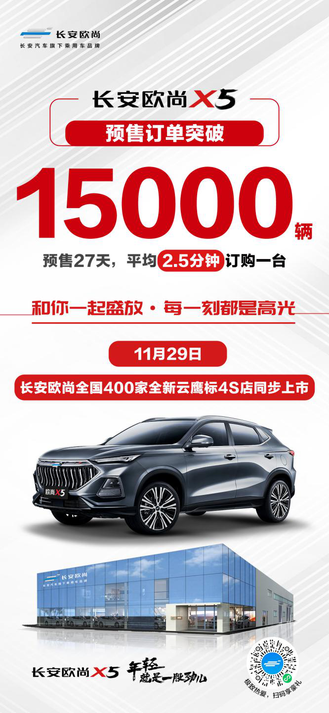11月16日,长安欧尚X5订单量正式突破15000台!预售开启27天,订单量再创新高,相当于平均2.5分钟就有用户订购一台!亮相即惊艳,预售即爆款,一直备受关注的超感·新运动SUV终获市场认可。据悉,长安欧尚X5将于11月29日在全国400家长安欧尚全新云鹰标店同步上市。