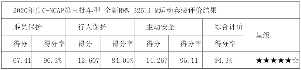 11月21日,全新BMW 3系以综合评价94.3的高分荣获C-NCAP超五星好评,成为2020年度目前为止评测的17款车型中评分最高车型。这是继去年中保研碰撞测试中获得优秀后,全新BMW 3系得到的再次认可。作为华晨宝马核心产品,全新BMW 3系采用了宝马集团最先进的生产工艺,并配备了丰富的主动安全配置,加上华晨宝马人对高品质的坚守,为中国消费者带来了又一款至臻完美的杰作。
