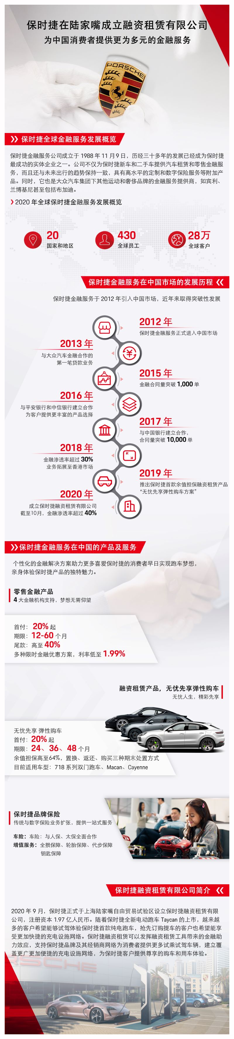 “保时捷金融服务自2014年进入中国市场以来,始终致力于向消费者提供灵活个性化的创新金融服务,并逐渐受到越来越多中国消费者的青睐。”保时捷中国总裁及首席执行官严博禹博士(Dr. -Ing. Jens Puttfarcken)表示,“保时捷融资租赁有限公司的正式成立,标志着我们在中国市场发展的不断壮大,以及进一步深耕汽车金融业务的决心。”