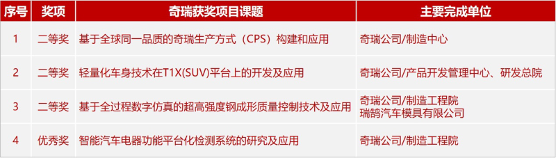此次再获“中国质量技术奖”,不仅增强了奇瑞汽车的核心竞争力,还将进一步提高奇瑞员工的质量工作热情,促进质量人员职业发展。未来,奇瑞将继续共享质量管理经验,推进汽车行业质量技术的创新、研究、推广与应用,促进我国质量技术进步,推动全社会的质量创新活动和高质量发展。