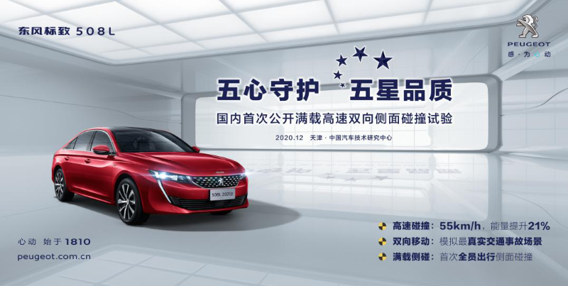 12月8日,东风标致508L在天津中国汽车技术研究中心碰撞试验室挑战“国内首次公开满载高速双向侧面碰撞试验”,获得圆满成功:得分率达88.75%,现场评定成绩为优秀。