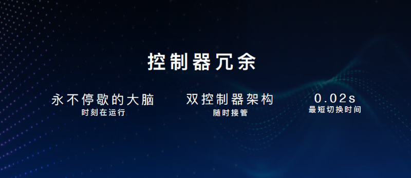 控制器冗余,采用双控制器,全时运转、互为备份,仿佛“永不停歇的大脑”。当一个控制器故障,另一控制器仅需20ms就可以接管车辆。