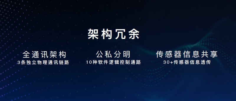 架构冗余,采用双通讯架构,有三条独立物理通讯链路,互为支撑,可实现10种软件逻辑控制通路及30+种传感器的实时信息共享。当单一链路出现信号中断,系统无缝安全衔接,为用户出行的安全性和舒适性提供保障。