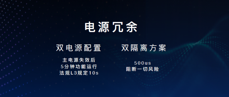 电源冗余,采用了双电源供应、双回路的“双保险”设计,两套电网间搭载高安全隔离器,可在500微秒内隔离电网故障,支撑执行安全降级动作。当主电网失效,备份电网可保证系统5分钟的失效运行时间,远高于目前法规要求的10秒钟,留给用户更充足的反应时间。