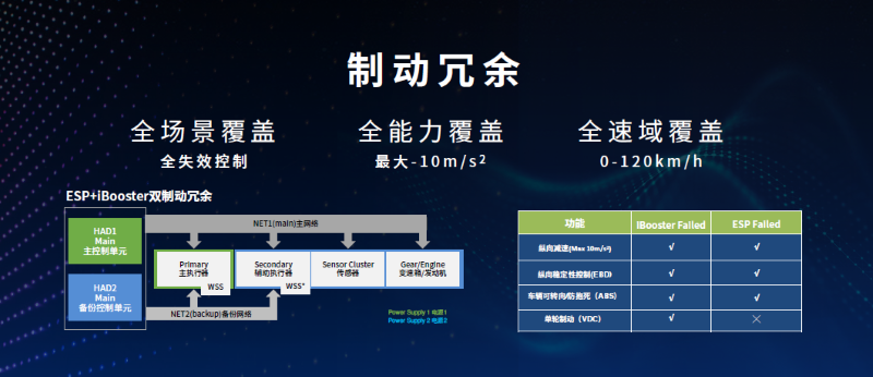 制动冗余,搭载ESP和IBOOSTER两套独立的电子制动控制单元,支持0-120km/h时速范围,有效规避用户担心的“刹车失灵”,即便单一硬件失效,依然提供最大-10m/s²的制动能力,杜绝“刹不住车”。