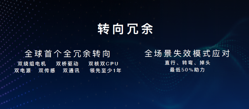 转向冗余,应用长城汽车旗下蜂巢转向研发的第三代智能转向产品,具备双绕组电机、双电机位置传感器、双CPU、双控制器,单一硬件电路故障,依然可实现50%助力。
